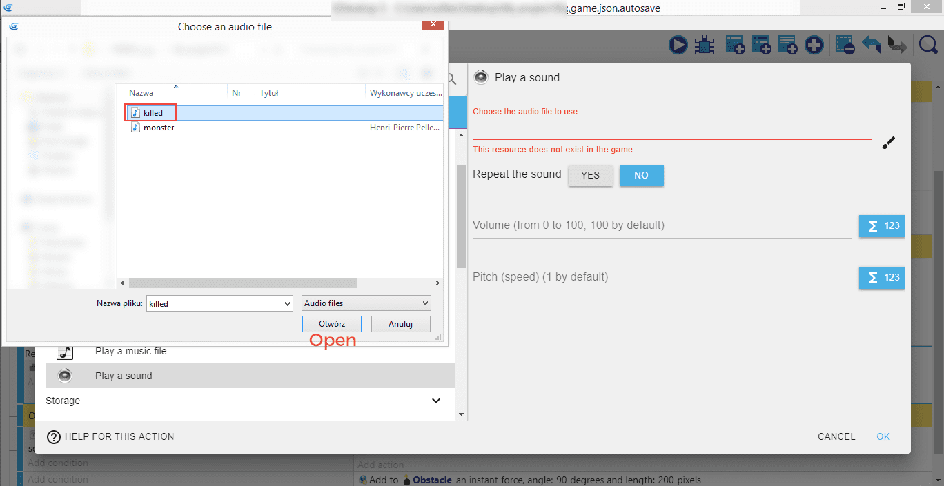 Select killed.wav file and open it to add it to the project.