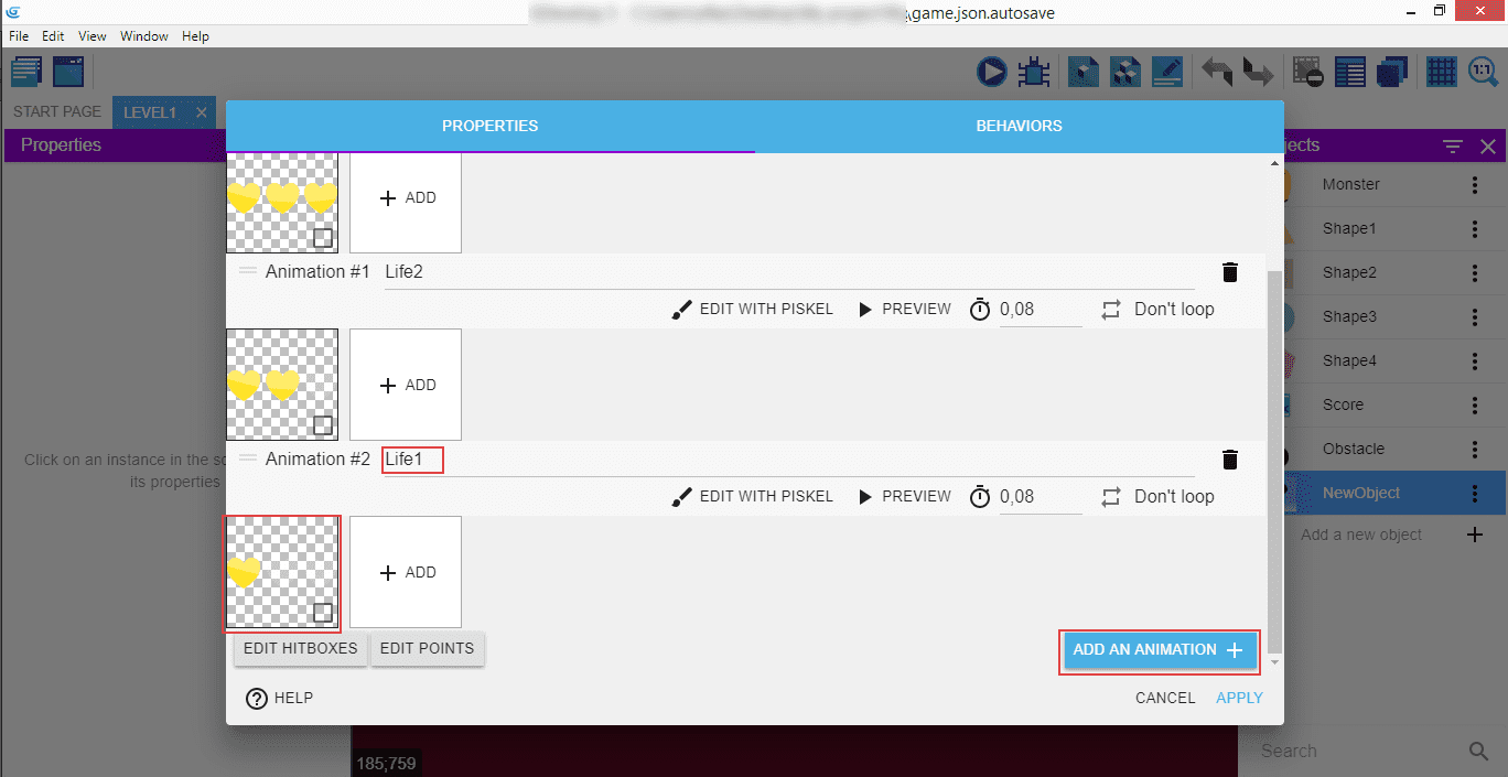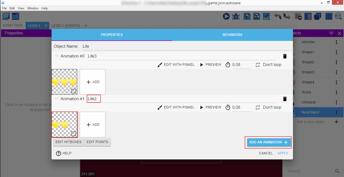 Object's name is "Life", "Animation" is "Life3" (since the initial state of the animation have three lives), and then add the image of the hearts.