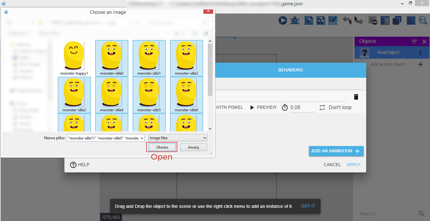 After giving him his new name, let's add some images that will represent him on the scene and in the game. Click on the "Add an animation" button to open a file select window.