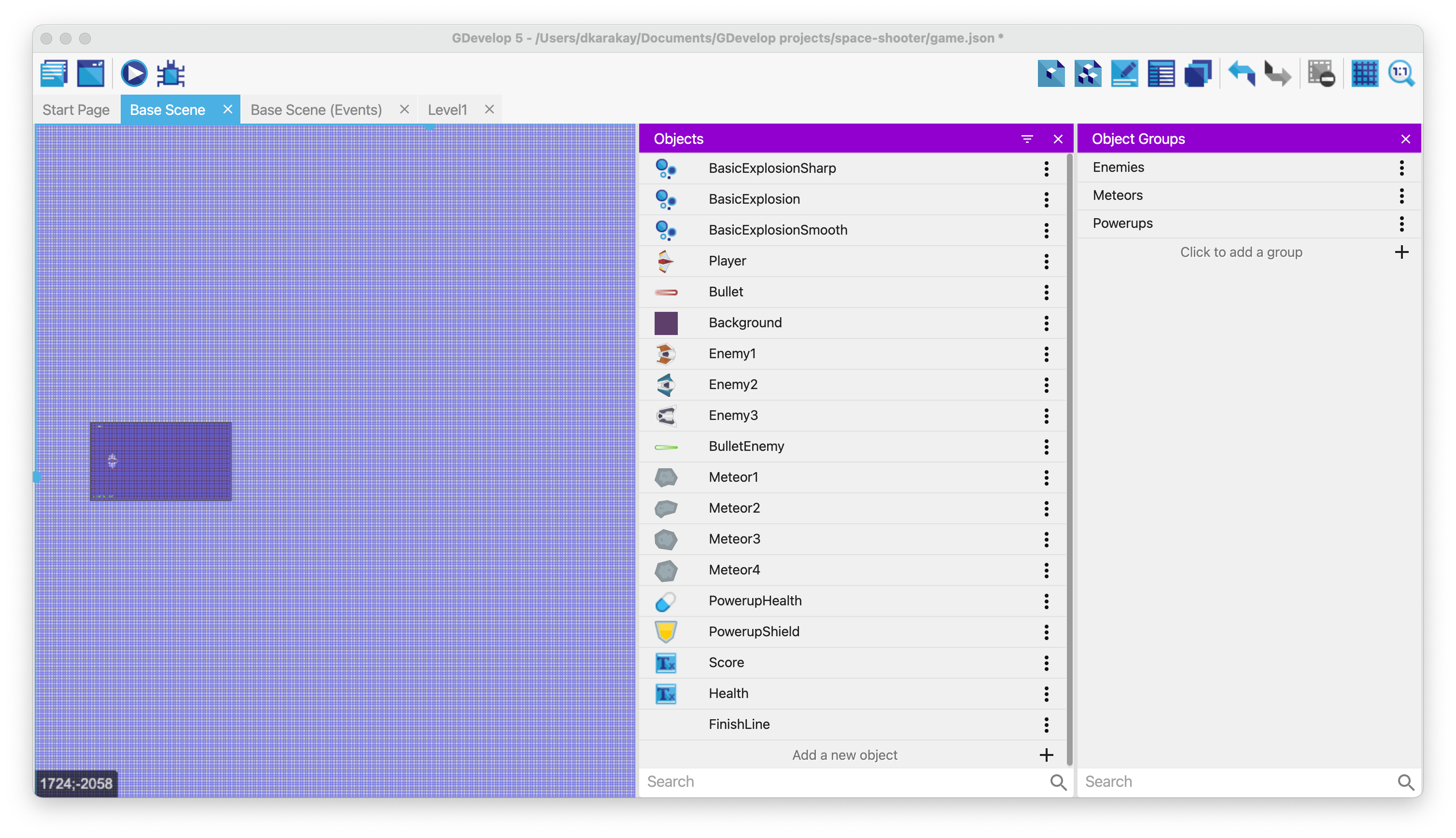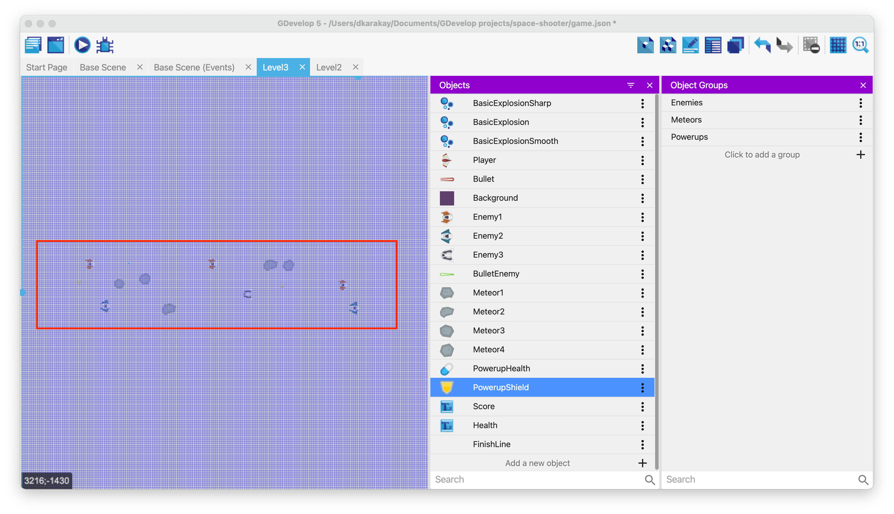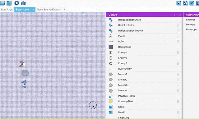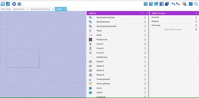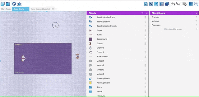 Now, we should go back to the Base Scene and delete all enemies, powerups, meteors, and the finish line. We will add those objects and set up our levels in the external layouts.