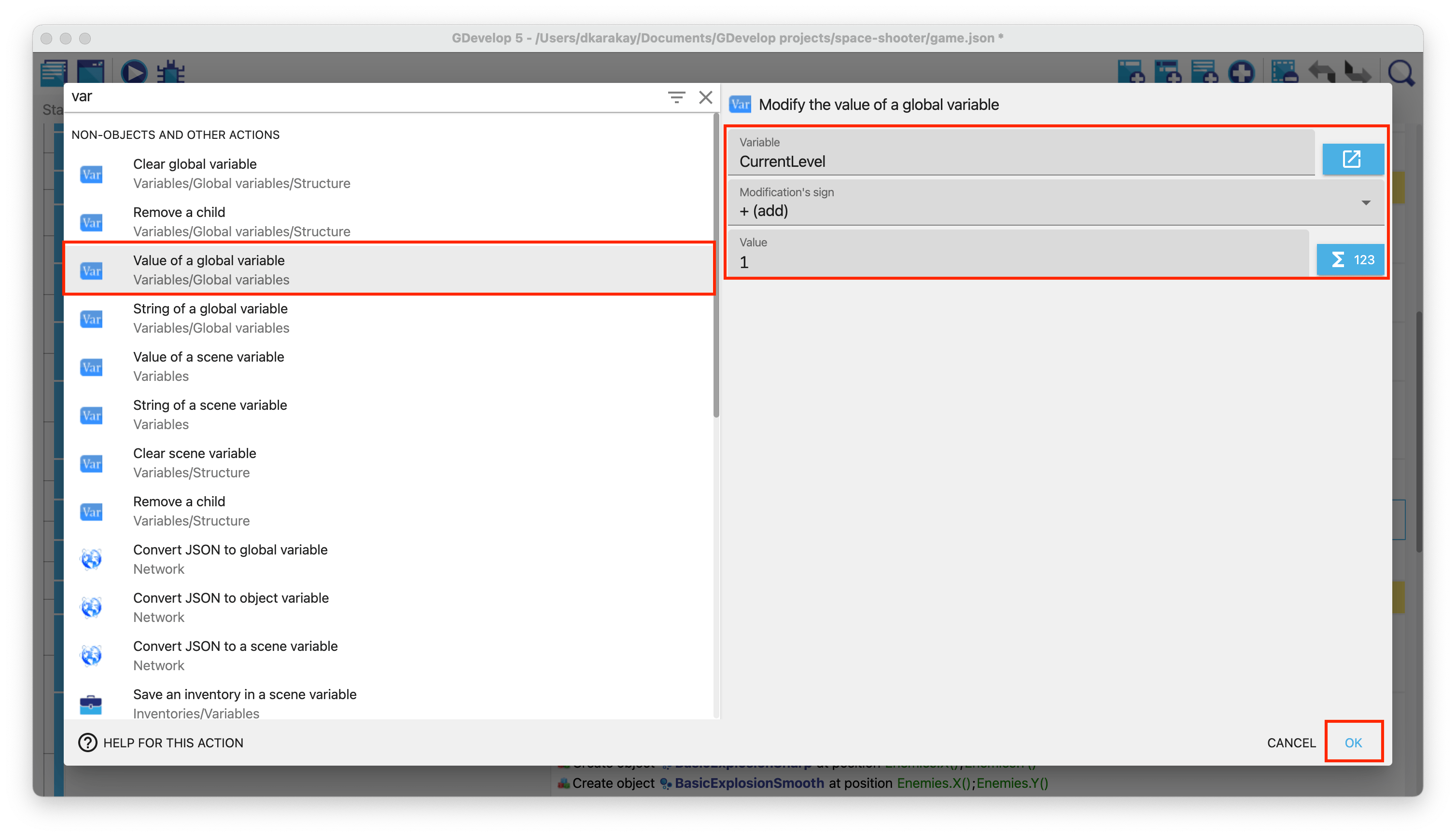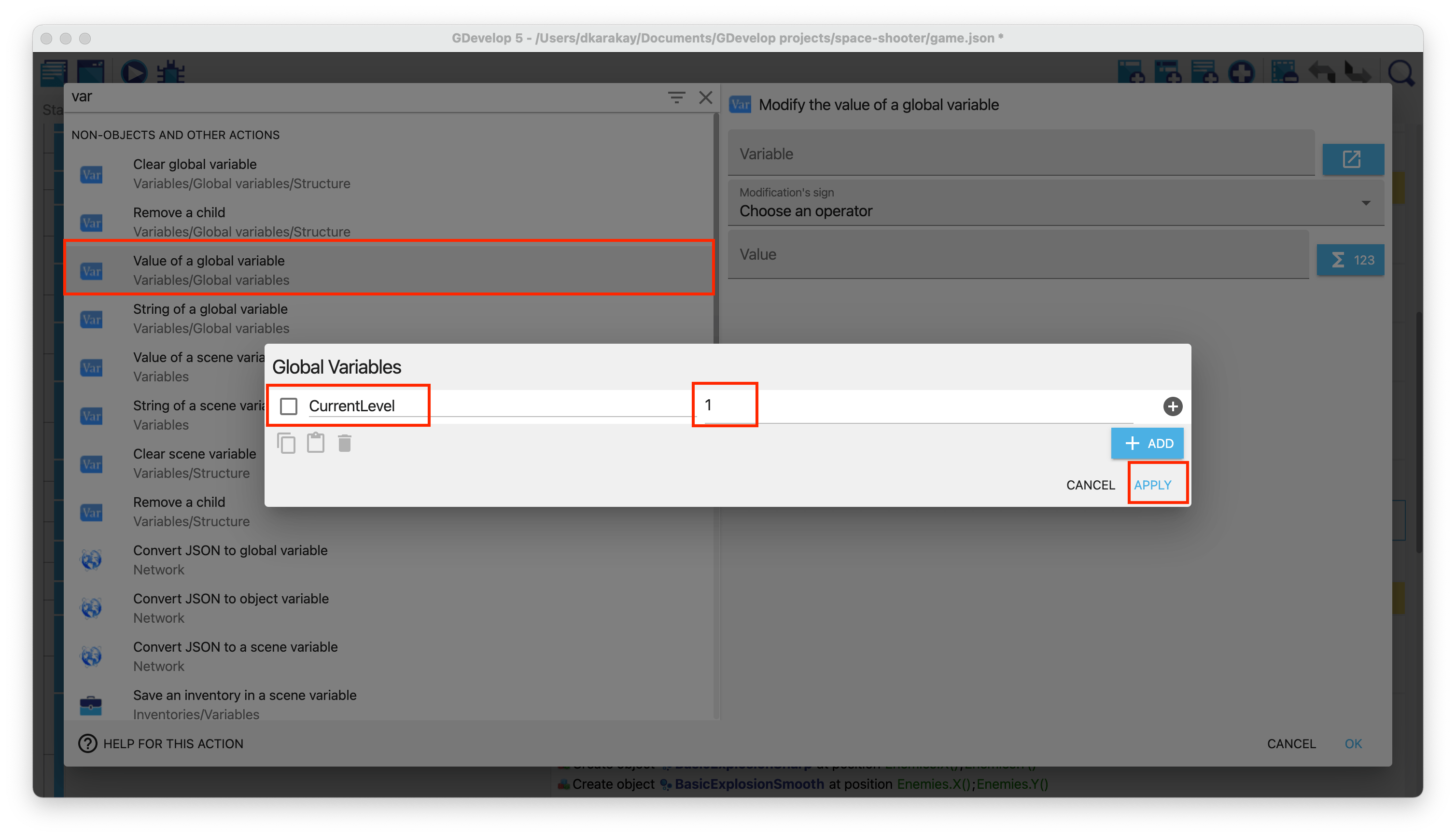 Open the Events tab, and add a new condition to determine the collision between Player and FinishLine. Then, create a new global variable called CurrentLevel and set to 1.